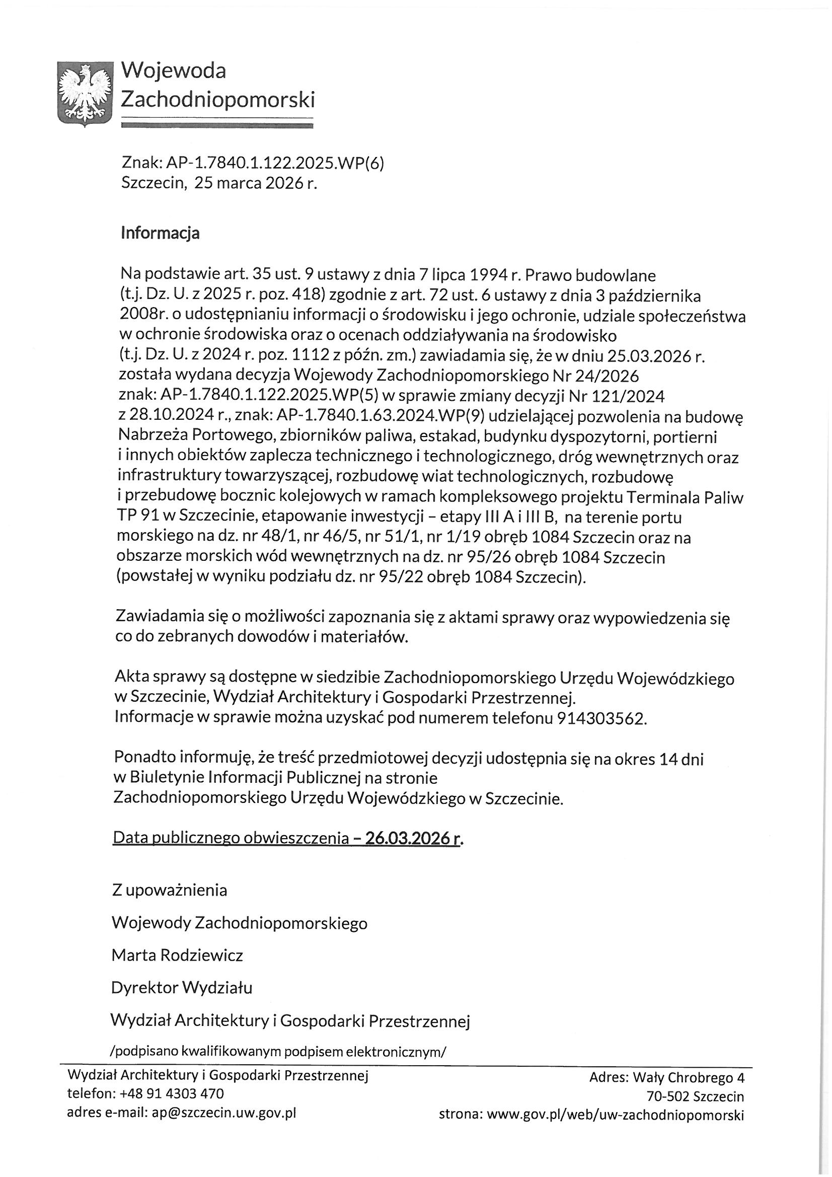 25.03.2026 r., została wydana decyzja Wojewody Zachodniopomorskiego Nr 24/2026, znak: AP-1.7840.1.122.2025.WP(5) w sprawie zmiany decyzji Nr 121/2024 udzielającej pozwolenia na budowę Nabrzeża Portow