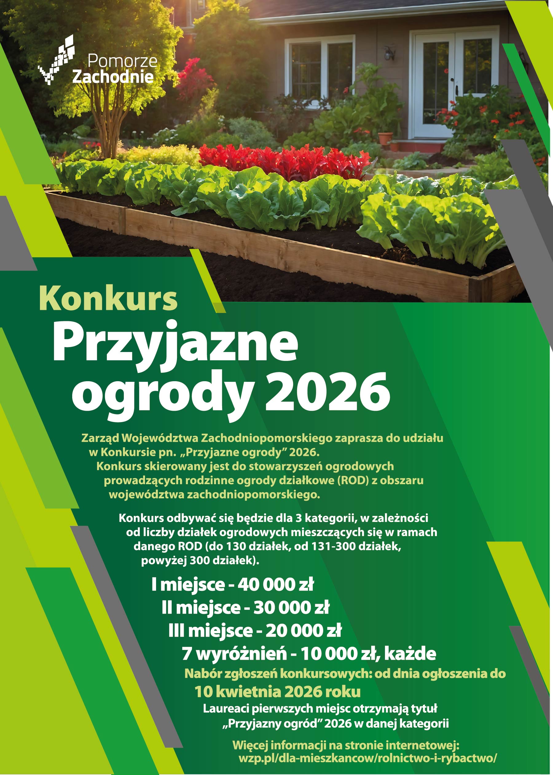 Zgłoszenia przyjmowane są od dnia ogłoszenia do 10 kwietnia 2026 r. Warunkiem udziału w konkursie jest przesłanie zgłoszenia pocztą (Urząd Marszałkowski Województwa Zachodniopomorskiego, ul. Marszałka Józefa Piłsudskiego 40, 70-421 Szczecin, z dopiskiem: Wydział Rolnictwa i Rybactwa Konkurs „Przyjazneogrody" 2026) albo złożenie go osobiście w kancelarii ogólnej Urzędu Marszałkowskiego Województwa Zachodniopomorskiego w Szczecinie.
