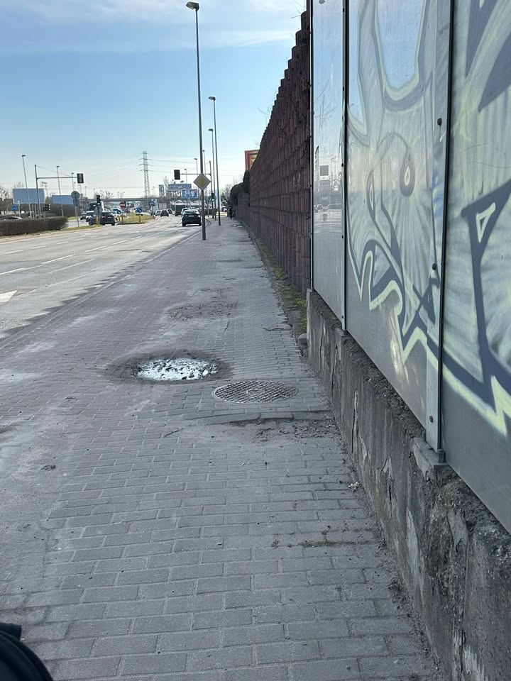 Kolejnym przykładem jest ul. Południowa, w rejonie salonów samochodowych, gdzie od dłuższego czasu znajduje się dziura w chodniku, która nie została naprawiona. Ponadto, na ul. Europejskiej, zauważono ślady po pojazdach służb porządkowych, które prawdopodobnie rozjechały część nawierzchni dla pieszych, w efekcie czego powstała znaczna dziura. Takie uszkodzenia nie tylko utrudniają poruszanie się, ale także stanowią zagrożenie dla pieszych, szczególnie w okresie złych warunków atmosferycznych – zdjęcia uszkodzeń nawierzchni w załączeniu.