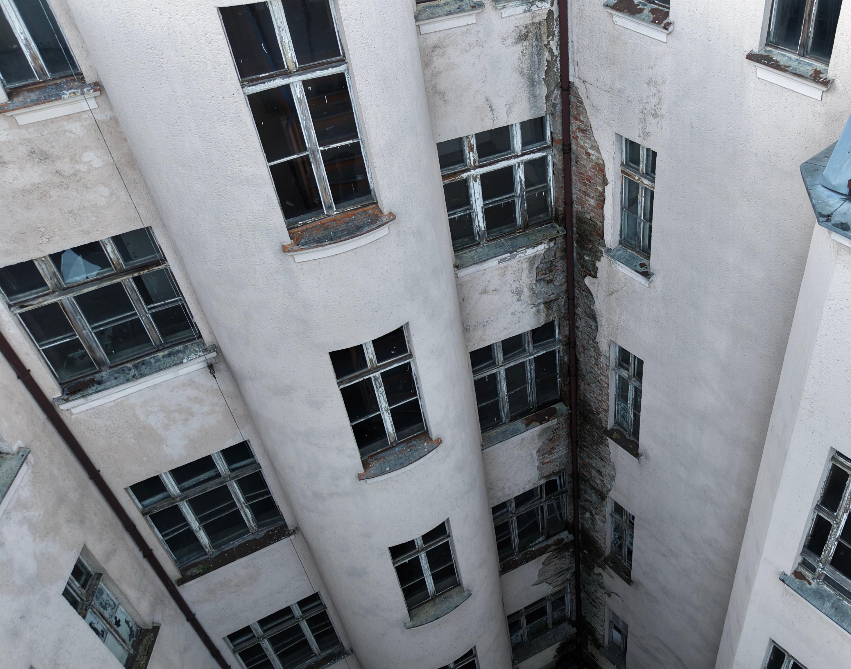 Co więcej dostęp do budynku od strony dachu jest niezabezpieczony. Na dachu otwarte są obie klapy umożliwiające wejście do budynku. Tynk odpada od ścian wewnętrznej elewacji.