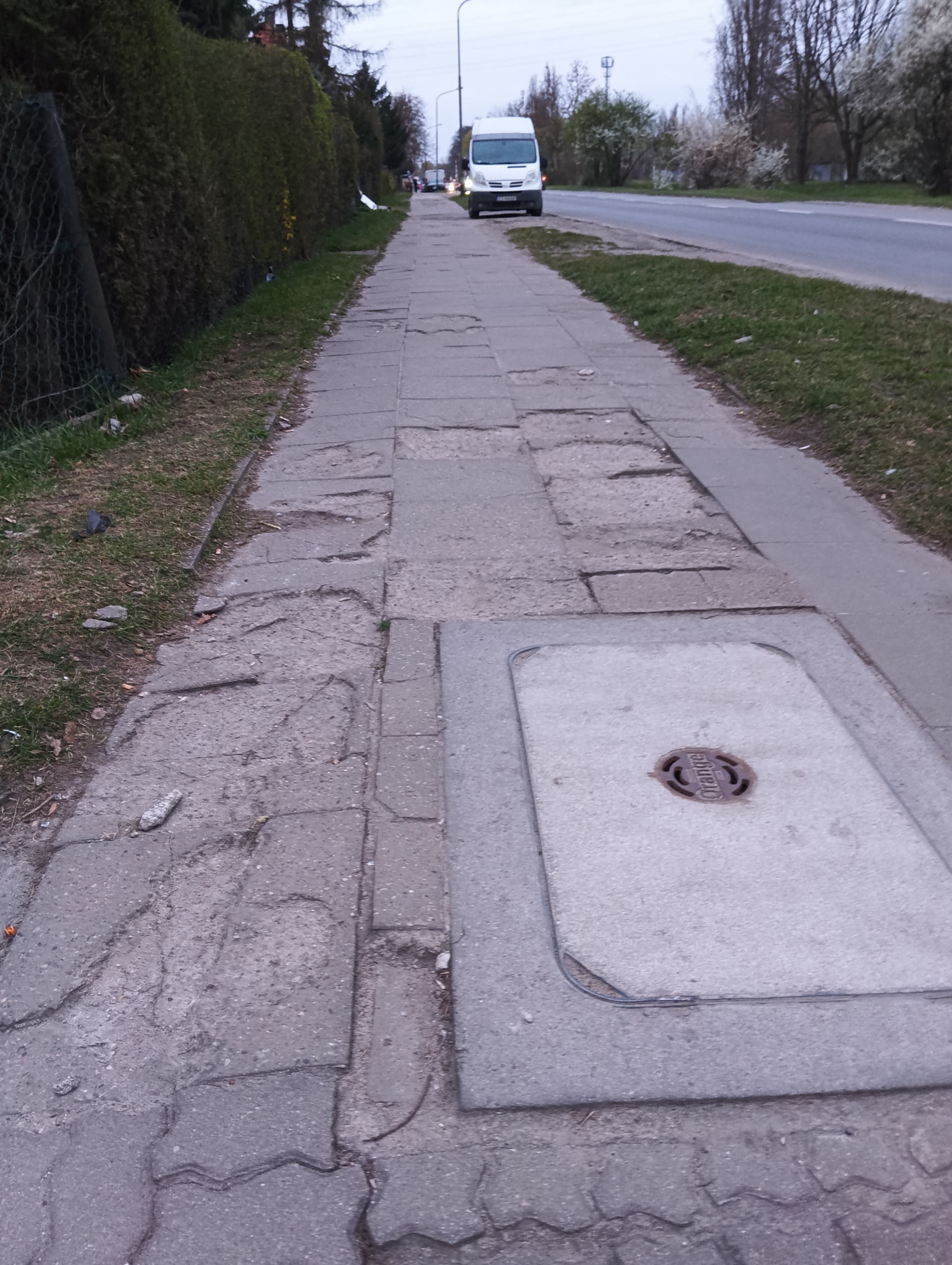 Wskazany fragment chodnika znajduje się w bardzo złym stanie technicznym, występują koleiny, nierówności oraz krzywe i zapadnięte płyty chodnikowe. Taki stan nawierzchni znacząco utrudnia bezpieczne poruszanie się pieszym.