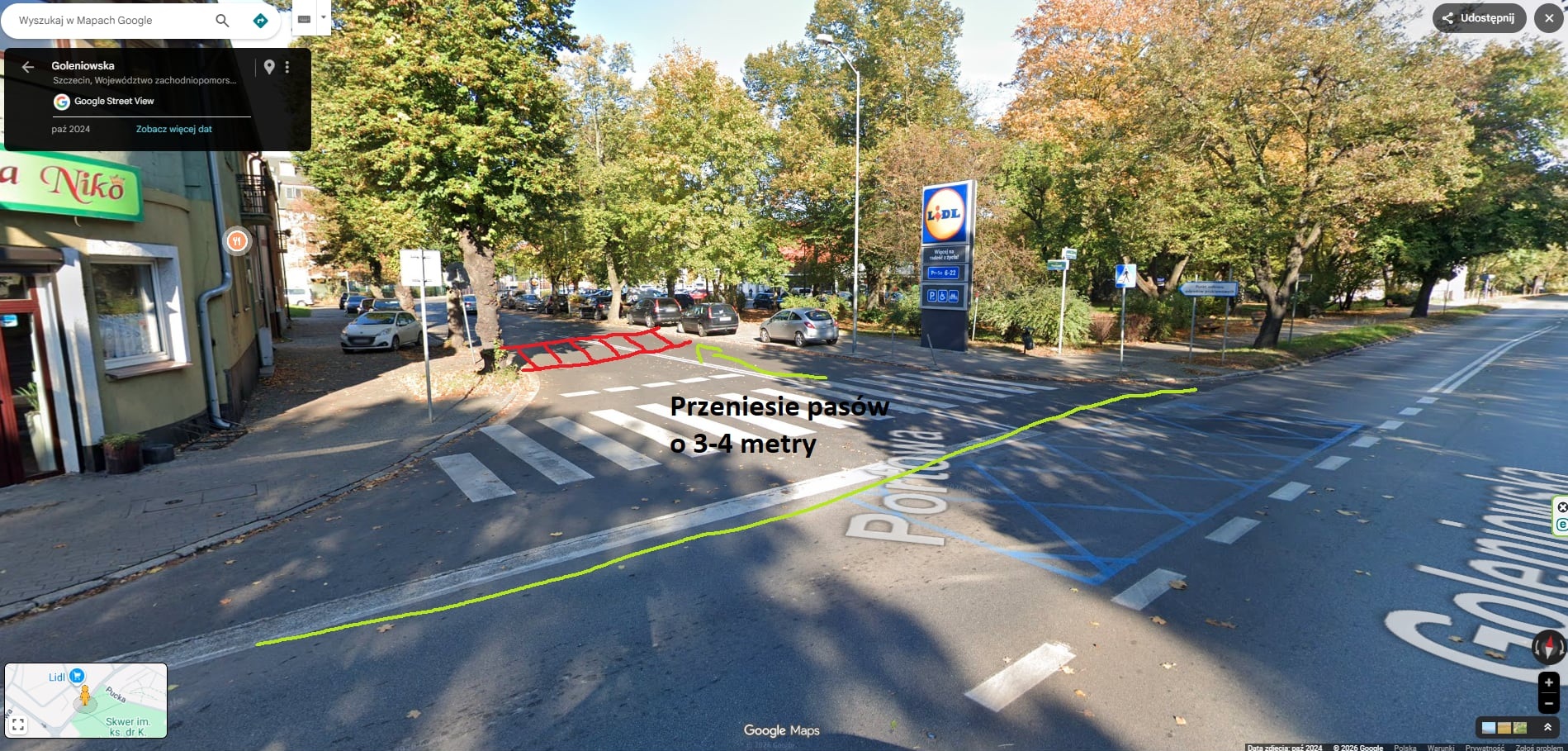 działając w dobrze rozumianym interesie ochrony pieszych przekraczających przejście dla pieszych na ul. Portowej w rejonie skrzyżowania ul. Goleniowskiej i ul. Portowej na Osiedlu Dąbie, zwracam się z uprzejmą prośbą o podjęcie działań zmierzających do poprawy bezpieczeństwa niechronionych uczestników ruchu drogowego (tj. pieszych) na tym przejściu dla pieszych.