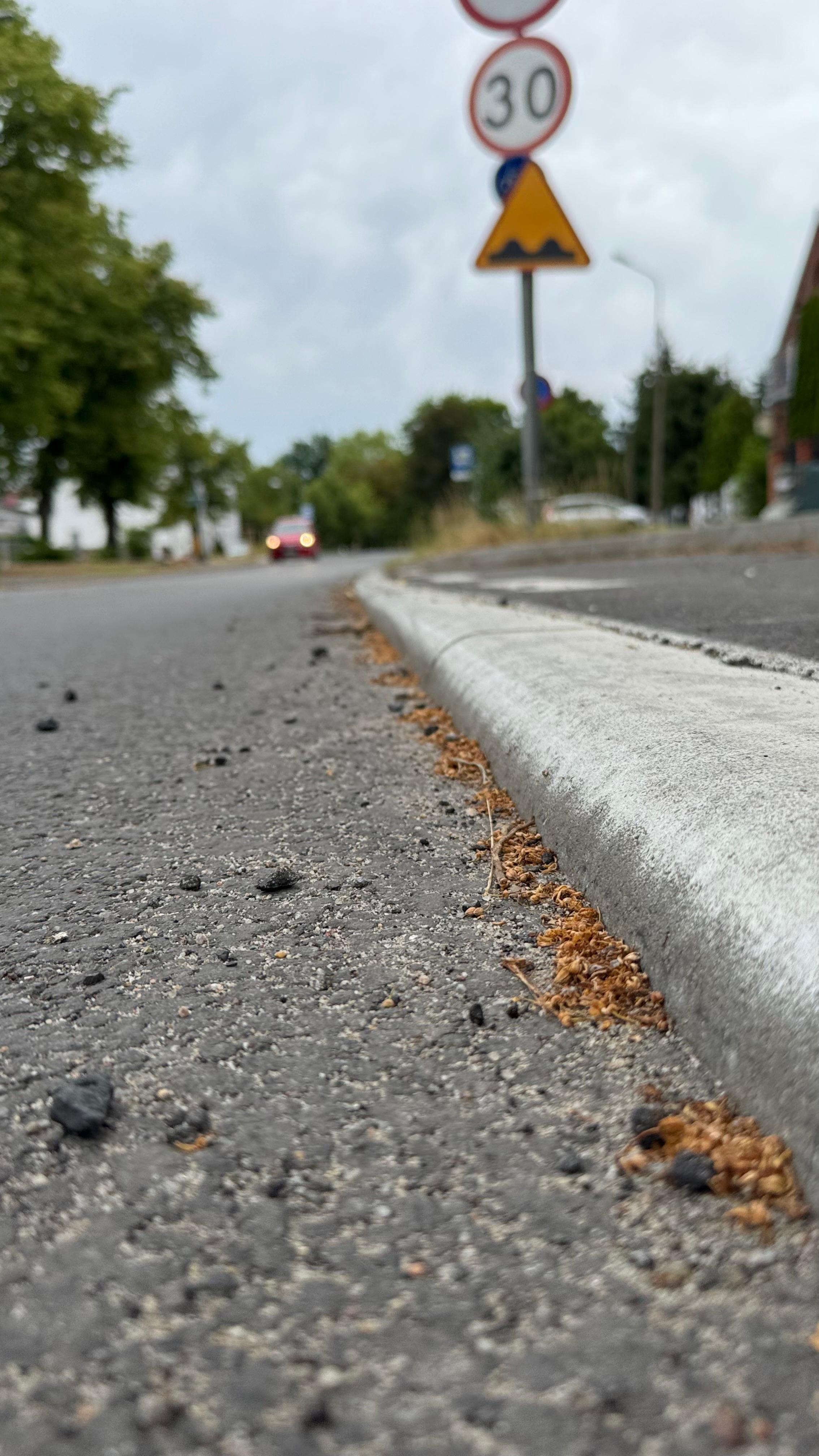 na ul. Szerokiej w Szczecinie, w ramach niedawno zrealizowanej inwestycji drogowej, wykonano zjazd z drogi dla rowerów (DDR) na jezdnię w sposób nieprawidłowy i niezgodny z zasadami bezpieczeństwa. Zamiast odpowiednio wyprofilowanego zjazdu umożliwiającego bezpieczne włączenie się rowerzystów do ruchu, pozostawiono wysoki krawężnik, który stanowi realne zagrożenie dla zdrowia i życia użytkowników drogi.