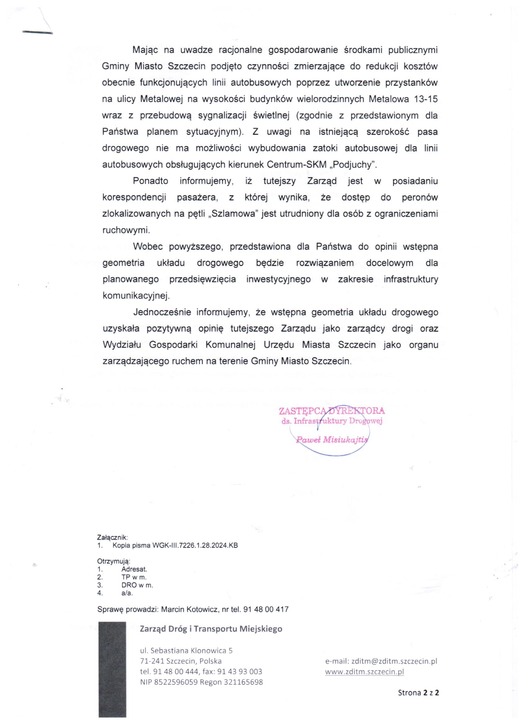 W projekcie nie przewidziano możliwości wykonania zatoki autobusowej, chociaż jak sugeruje RO istnieje taka możliwość przynajmniej z jednej strony (obok są grunty GM Szczecin). Na tych przystankach krzyżują się 4 linie autobusowe, dzieci wysiadają i wsiadają idąc do Szkoły Podstawowej nr 12. Dotychczasowa pętla, zapewniała odpowiednią ilość miejsca dla bezpiecznego poruszania się wsiadających i wysiadających pasażerów. Załączam uchwałę 223/24 oraz odpowiedź ZDITM.