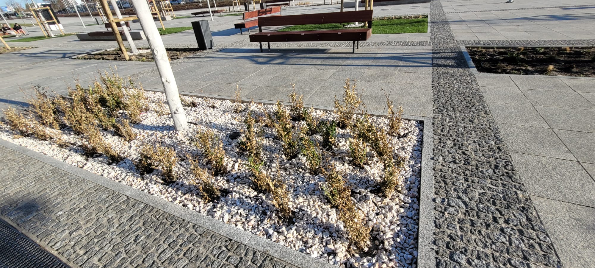 W tych warunkach bukszpan wieczniezielony - gatunek dominujący w nasadzeniach - znalazł się w sytuacji modelowej dla tzw. suszy fizjologicznej zimowej: rośliny bez wykształconego systemu korzeniowego traciły wodę przez liście, nie będąc w stanie jej uzupełnić z zamarzniętego podłoża. To klasyczny mechanizm masowego zamierania tego gatunku po zimie. Rozsądnym wydaje się w tej sytuacji postawienie pytania: czy termin wykonania nasadzeń – grudzień, a więc poza optymalnym oknem jesiennym – oraz dobór gatunku silnie wrażliwego na suszę fizjologiczną i mróz przy braku ukorzenienia były uzgadniane z jakimkolwiek specjalistą, a jeśli tak – to z jakim wynikiem tej konsultacji?