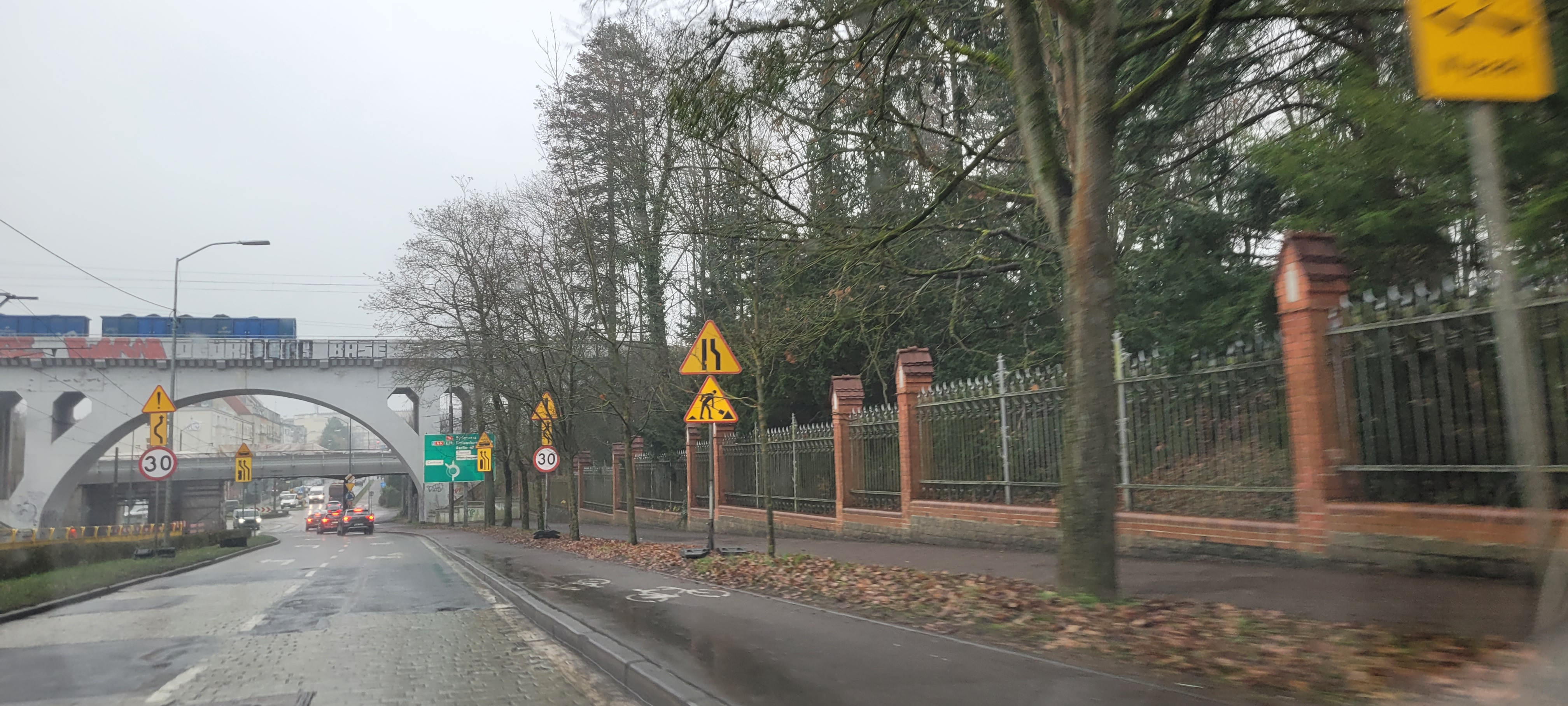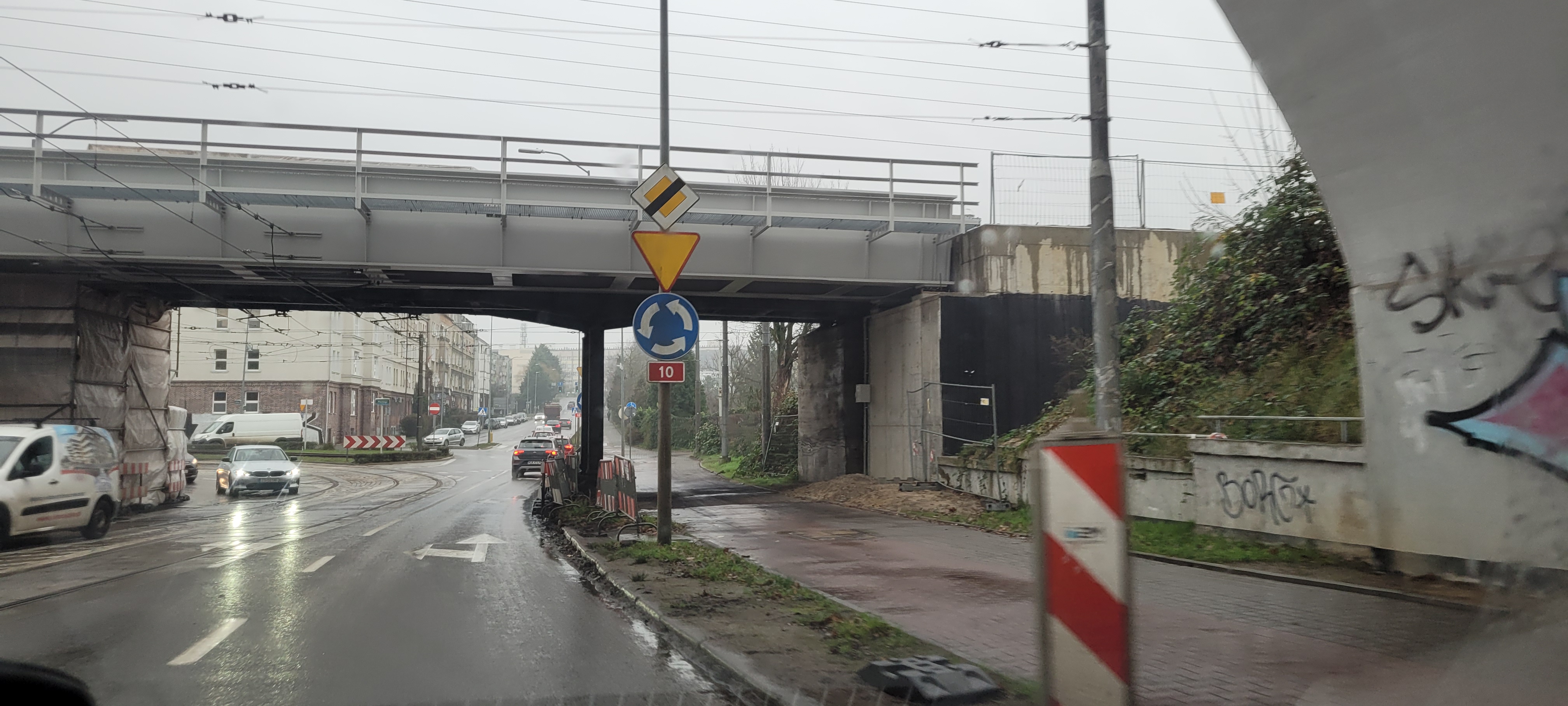 Bezpośrednio przed wiaduktem, tuż przed rondem, nadal znajduje się znak ostrzegawczy A-12b ostrzegający o zwężeniu jezdni z prawej strony. W praktyce miał on ostrzegać kierowców o pracach prowadzonych przy wiadukcie i związanym z nimi ograniczeniu skrajni jezdni. Jednakże – jak wynika z obserwacji oraz informacji od mieszkańców – od końca października bieżącego roku prace na tym odcinku nitki południowej nie są już prowadzone. Roboty realizowane są obecnie wyłącznie na równoległej jezdni północnej (czy też pod samym wiaduktem na północnej części jezdni, na skrajnym prawym pasie).